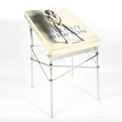 Sehr großer Fotobildband. Hrsg. von June Newton, nummeriert 4378/10000 und handsigniert von Helmut Newton. Fester Einband mit Schutzumschlag. Dazugehöriges verchromtes, klappbares Gestell von Philippe Starck entworfen. Auf den Auflageteilen vorn 'Helmut Newton' und rückseitig 'Starck' beschriftet. Im Originalkarton