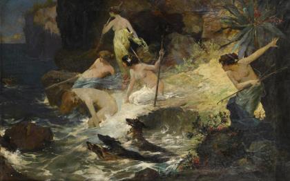 Die Göttin mit Ihrem Gefolge bei der Jagd auf einen Hirsch, der sich ins Wasser flüchtet, an felsiger Steilküste
