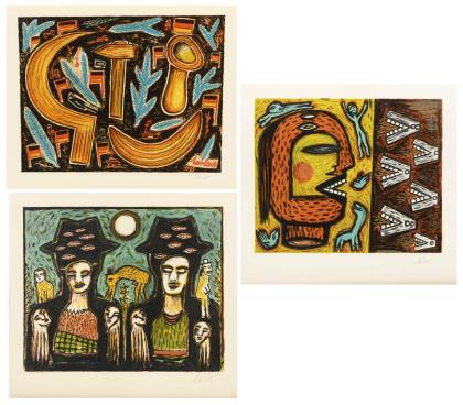 Heisig, Bernhard (1925 Breslau - 2011 Strodehne): "Lenin und der ungläubige Timofej", Lithografie, Bleistiftsignatur, Blatt: 50 x 37,8 cm, Blattrand griffspurig und leicht gebräunt | Ausstellungsplakat "Ausstellungen im Foyer Bernhard Heisig 20. Mai bis 12. Juni 1980", Farbsiebdruck, Bleistiftsignatur mit Widmung "für Rosemarie Jüdisch herzlich Bernhard Heisig", Blatt: 57 x 40,5 cm, Blatt knickspurig und mit Riss am linken Rand | Tessmer, Heinrich (1943 Rottluff - 2012 Berlin): "Trinidad", Farblithografie, Bleistiftsignatur mit Widmung "Alle Guten Wünsche zum Geburtstag Heinrich Tessmer", [19]80, Exemplar: 20/6, Blatt: 55 x 45 cm, linker Rand mit Riss, Randbereich griffspurig | Ohne Titel, Lithografie, Bleistiftsignatur, [19]84, Exemplar "A.", Blatt: 39,5 x 42,5 cm,