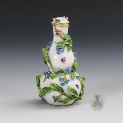Silber, kobaltblaues und grünes Email, umlaufend ornamentale Goldbemalung. Original-Stöpsel, Verschlusskappen an Kettenaufhängung. Punzen: Meistermarke, Amtspunze. Feingehalt mit Säure geprüft