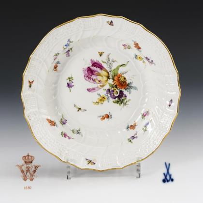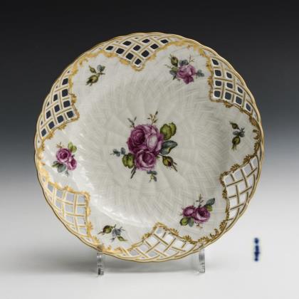 Modell "Ozier". Teller mit teils korbdurchbrochener Fahne und korbreliefiertem Spiegel. Im Spiegel und auf der Fahne kleine Blumenbuketts mit roten Rosen