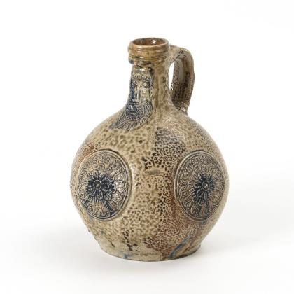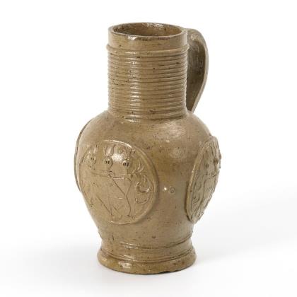 Kugellbauchkrug mit gerilltem Zylinderhals und abgesetztem Stand sowie endvolutiertem Bandhenkel. Auf der Wandung 3 aufgelegte Medaillons mit Wappen- und Helmzier