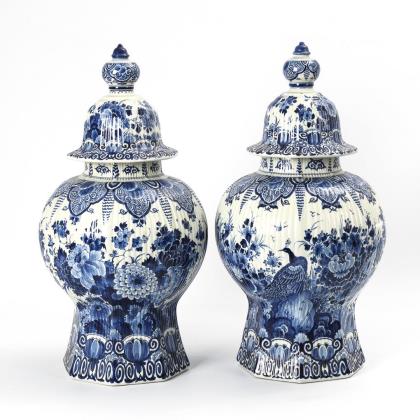 Paar sehr große Delfter Fayence-Deckelvasen mit exotischen Blumen und Vögeln. De Porceleyne Fles, Joost Thooft.