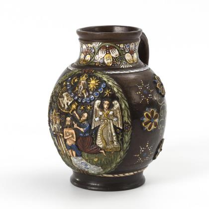 Historisierender Kugelbauchkrug mit profiliertem Bandhenkel, Reliefdekor mit figurenreicher Szene der Taufe Christi und großen Blüten