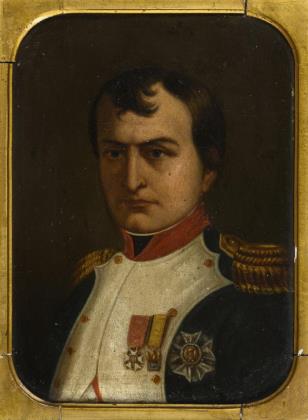 Zylindertasse mit spitz gewinkeltem Henkel. Schauseitig in einem Lorbeerkranz das bezeichnete Biskuitbildnis des sächsischen Königs Friedrich August I. (1750-1827, König von Sachsen ab 1806)