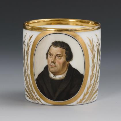 Zylindertasse mit Ohrenhenkel. Schauseitig ein goldgerahmtes Medaillon mit dem Bildnis Martin Luthers (1483-1546). Ohne Untertasse