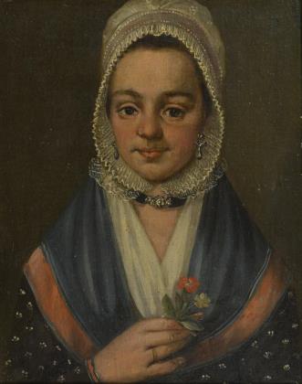 Porträt einer jungen Frau im herrschaftlichen Kleid mit dunkler Kopfbedeckung
