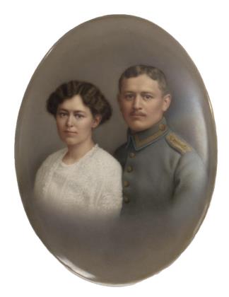 Ovale Bildplatte mit dem Bildnis eines jungen Mannes in Uniform und seiner Gattin im weißen Kleid. Dazu eine Fotografie des jungen Paares
