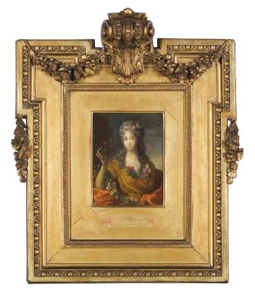 Attraktives Charakterporträt einer eleganten jungen Dame. Vergoldeter Stuckrahmen