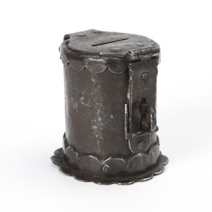 Walzenförmige Spardose mit vielpassigem Fuß und Scharnierdeckelrand sowie verzierte Beschläge für das Scharnier und die Öse der Haspe