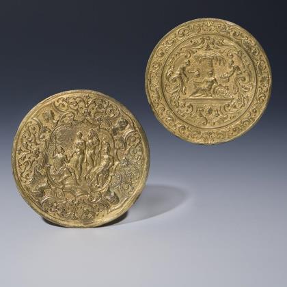 Replik, vergoldete, beidseits sehr fein reliefierte Medaille. Im Spiegel je eine figürliche Szenerie: Das Urteil des Paris und Allegorie-Der Reichtum. Am Rand Ornamentbordüren, flache Form