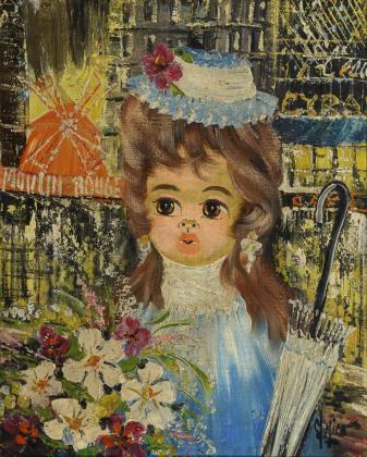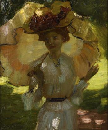 Undeutlich signiert: Frau mit Strauß und Schirm.