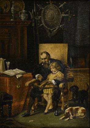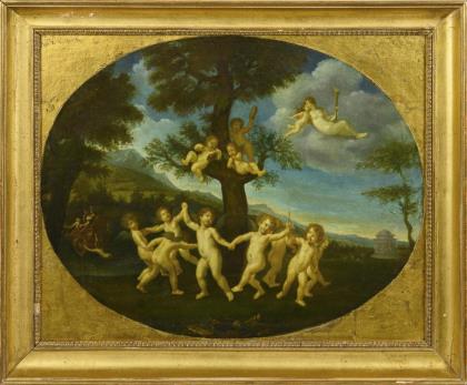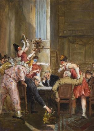 Lebhafte figurenreiche Genreszene mit ausgelassenen maskierten Damen und Clowns, die der seriösen Herrenrunde zu Leibe rücken. Rückseitig männliche Porträtstudie. Vergoldeter Stuckrahmen