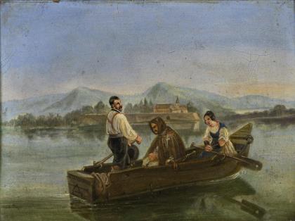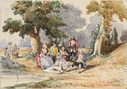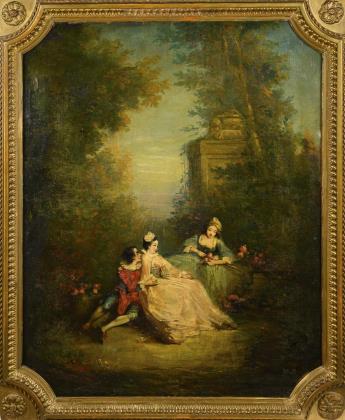 Sehr fein und detailreich gemalte, figurenreiche Genreszene in romantischer Landschaft. Verglaster, geschnitzter Rahmen, goldgefasst