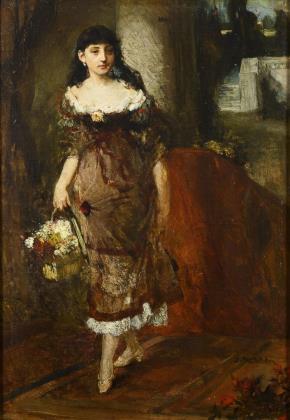 Junge Frau im Kleid und mit Blumenkorb in südlichem Interieur