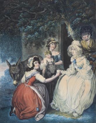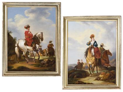 Reiter mit Horn auf einem Pferd lässt eine junge Dame nach einer Rose greifen, welche er absichtlich zu hoch hält