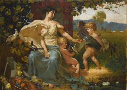 Junge Frau in antikisierender Kleidung unter Weinreben und bei einem mit Obst gefüllten Boot sowie drei Knaben, Tauben und eine Ziege