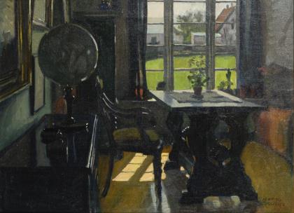 Globus auf Kommode vor einer Wand mit Gemälden, davor ein Tisch mit Stuhl und eindringendes Sonnenlicht durchs Fenster