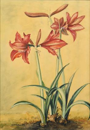 Drei blühende Amaryllis vor gelblichem Hintergrund