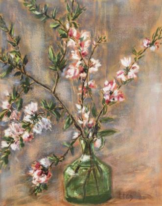 Blühende Obstzweige in grüner Flasche