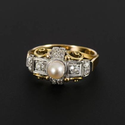 Art-déco-Ring mit Zuchtperle und Altschliff-Diamanten.