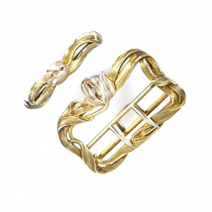 Ovaler Klappreif und Steggliederband mit Gravuren. Kastenschloss, Karabinerschließe