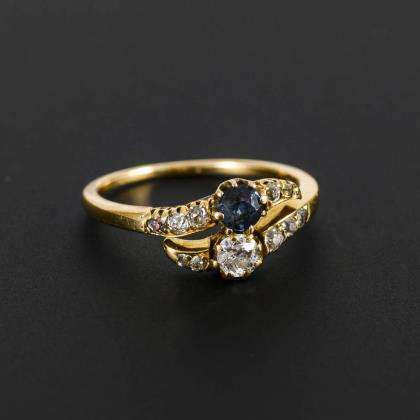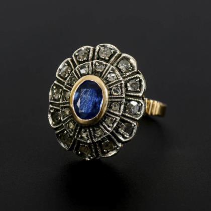 Ring mit Altschliff-Brillant, Saphir und Diamantrosen, um 1900.