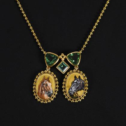 3 zargengefasste Steine und 2 Abhängungen mit gemalten Pferdeköpfen. Kugelgliederkette mit Ringfederschließe