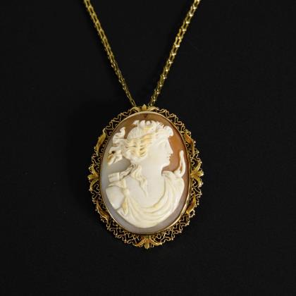 Anhänger/Brosche mit Muschelkamee an Kette, Ende 19. Jh.