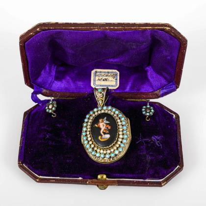Reliefiertes, großes Medaillon mit Miniatur des Amor auf schwarzem Grund, umgeben von Perlchen und Türkiscabochons. 2 gerahmt verglaste Innenfächer.