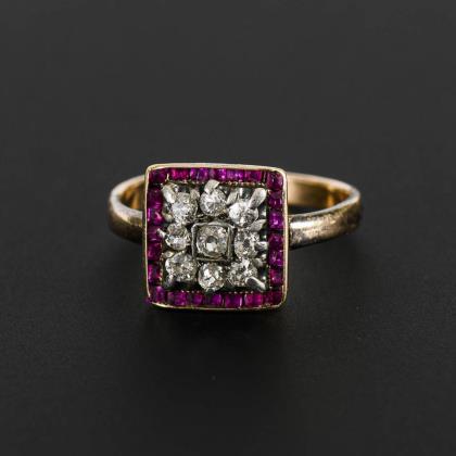 Ring mit Altschliffdiamanten und Rubinen, um 1900.