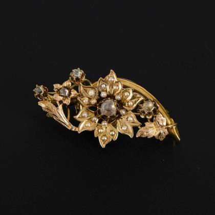 Brosche mit Altschliff-Diamanten und Perlchen Ende 19. Jh.