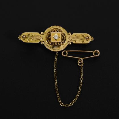 Filigranverzierte Ornamentbrosche mit kleinem Altschliffstein. Hakenverschluss mit Sicherheitskette und -nadel