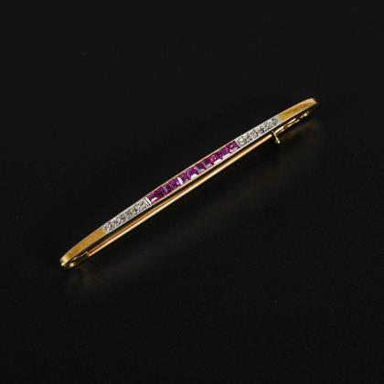Schmaler Steg mit 11 kleinen Rubincarrés und 12 Diamantrosen. Hakenverschluss mit Kippsicherung
