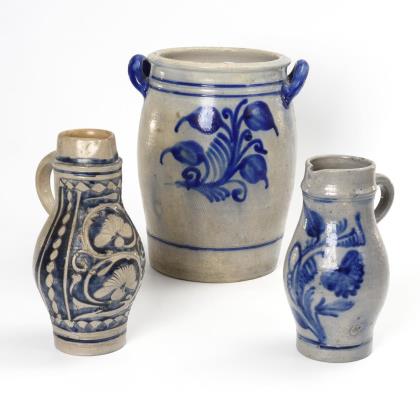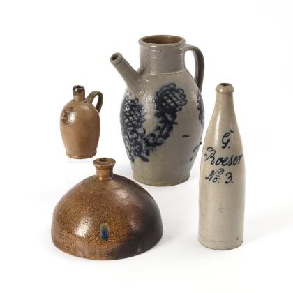 Defekter Tüllenkrug mit großen Blumen, H 32,5 cm. Bitterwasserflasche, H 31 cm. Schnapskrüglein, datiert "Anno 1754", H 15 cm. Seltenes Halbkugelgefäß mit kurzem Enghals, H 15 cm