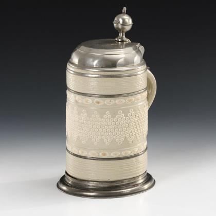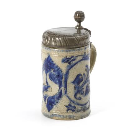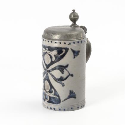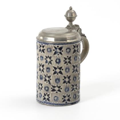 Walzenkrug mit Bandhenkel. Querrillen- und Stempeldekor mit umlaufendem Rosettenfries und Blattbändern. Zinnmontierung mit gepunztem Deckel, Kugeldrücker, Wandungsringen und Henkelband sowie Zinnstand
