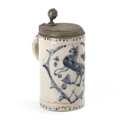 Schnelle mit gemalten Wappen (3 Hörner) und Sinnspruch sowie Jahreszahl "1589". Reliefierter Zinndeckel mit Delfin-Drücker und graviertem Horn. Dazu Brief von 1947 mit Widmung zu dem Krug
