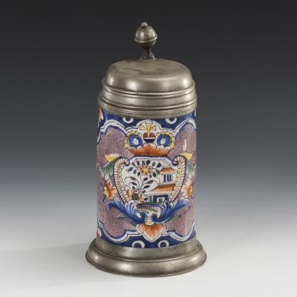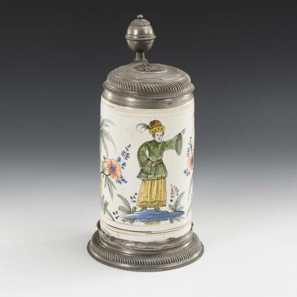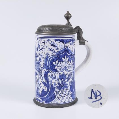 Zylinderkrug mit strichverziertem Bandhenkel. Umlaufend 3 Barockreserven mit großen Blumen. Profilierter Zinndeckel mit Kugeldrücker, graviert "HB 1777", innen gepunzt, Zinnstand