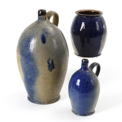 2 Enghalsflaschen und 1 Zylindergefäß mit Blauschürzen. Bürgel.
