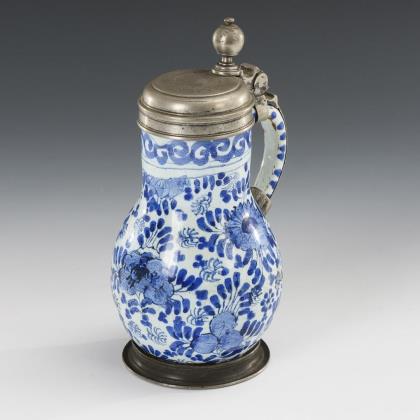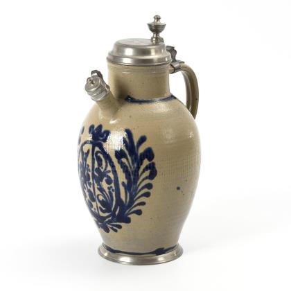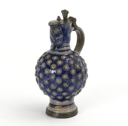 Enghalskanne mit Kugelbauch und 7 Reihen aufgelegter Rosetten, abgesetzter Hals mit Löwenfratze und abgesetzter Rundstand, gekehlter Bandhenkel mit eingerolltem Ansatz. Ergänzter Zinndeckel mit Muscheldrücker, gepunzt