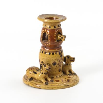 Glatter Tropfteller auf teils durchbrochen gefertigtem Säulenschaft mit durchgehend offener Tülle, breiter Scheibenfuß mit 2 wachenden Hunden und 2 Löchern im Boden. Dazu ein kleines loses Tier, als Wächterfigur in die Tülle einsetzbar