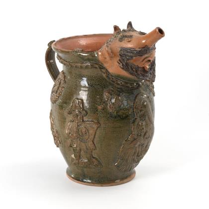 Bauchige Kanne mit aufgelegtem Reliefdekor, u.a. sakrale Mutter-Kind-Darstellung, historisierende Musikanten und Weintrauben, Bandhenkel und figürlichem Ausguss in Form einer bärtigen (Teufels-)Fratze mit langer Tülle als Nase