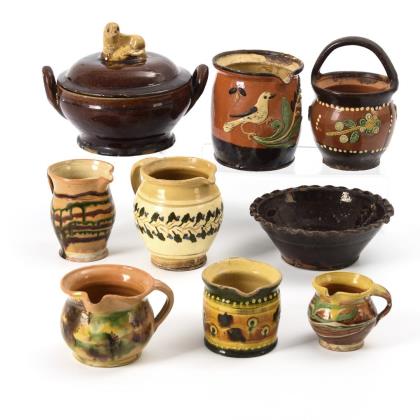 6 Krüge, 1 kleine Henkelbraut, 1 Terrine mit 2 Henkeln und Deckel mit Löwenknauf, 1 Schale mit Wellenrand