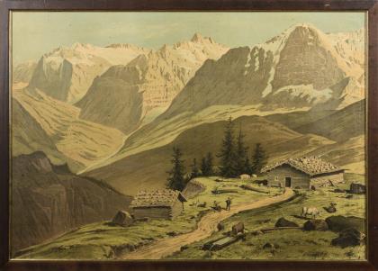 5 Wandbilder zur Dekoration der Schule und Veranschaulichung des Unterrichtsstoffes: Darstellung der Insel Helgoland | Darstellung einer Klosterszene mit Mönchen | Darstellung einer Hochzeitsszene im Spreewald mit Kahnfahrt | Darstellung eines Schäfers mit Herde | Darstellung einer bäuerlichen Hütte in den Alpen