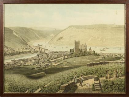 5 Wandbilder zur Dekoration der Schule und Veranschaulichung des Unterrichtsstoffes: Joseph Ferdinand Klemm (1868 - 1916): Mittelalterliche Stadtansicht, [19]04 | Ansicht des Loreleyfelsens und Umgebung | Fritz Stoltenberg (1855 - 1921): Ansicht des Kiel-Kanals | Ansicht des Rheinfalls | Darstellung einer bürgerlichen Stubenszene des 17. Jh
