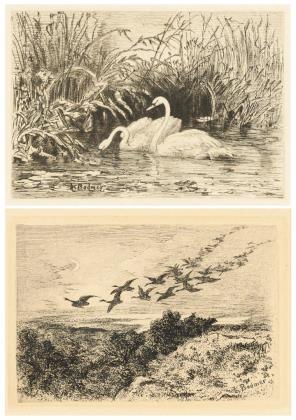 Schwanenpaar im Schilf, Platte: 12 x 16,5 cm, Blatt: 16,5 x 24,5 cm, im Passepartout: 33 x 37 cm, Blatt beschnitten, Rand leicht gebräunt, etwas stockfleckig | Vogelzug über Seenlandschaft, Platte: 10 x 14,5 cm, Blatt: 15 x 25 cm, im Passepartout: 33 x 36,5 cm, Blatt beschnitten, Blatt gebräunt