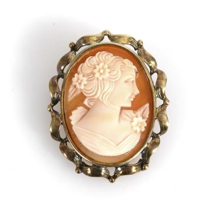 Zargengefasste Kamee mit geschnittenem Mädchenprofilkopf. Seitliche Randzier mit 2 kleinen, eingelassenen Brillanten. Kugelhaken und Klippöse