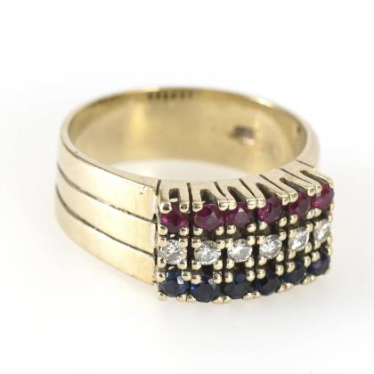 Je 6 chatongefasste, kleine Saphire, Brillanten und Rubine zwischen 3-stegiger Schiene