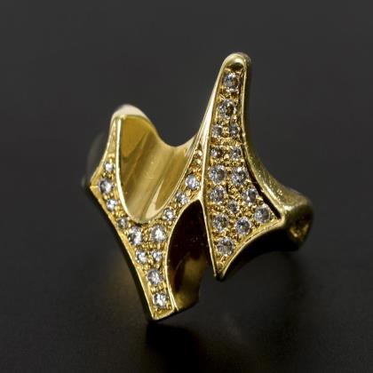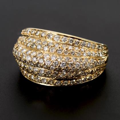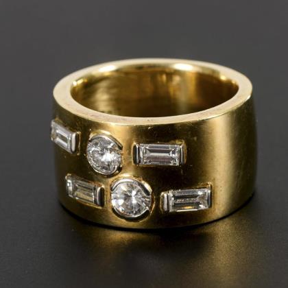 Breite Ringmitte mit 164 kleinen, pavégefassten Brillanten. Mittlere Schiene