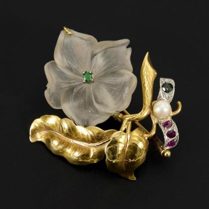 Plastisch gestaltete Brosche mit geschnittener Bergkristallblüte, Zuchtperle, grüner Farbstein, eingelassener Turmalin und 3 Rubine. Schiebehaken